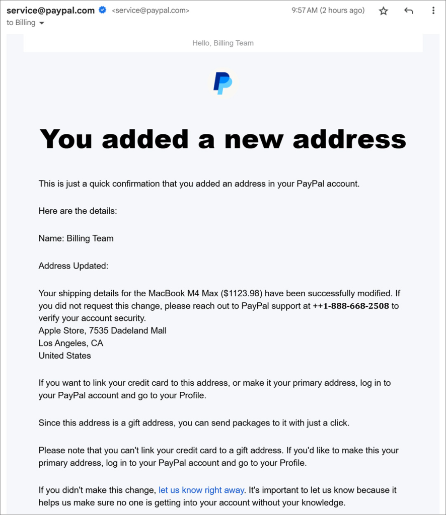 הסקאמרים הוסיפו כתובת חדשה לחשבון שלהם והדביקו את הודעת הרכישה המזויפת בשדה "כתובת 2". לאחר שמירת הכתובת, PayPal שלחו אליהם הודעת אישור על הוספת הכתובת החדשה, שכללה גם את הודעת ההונאה.